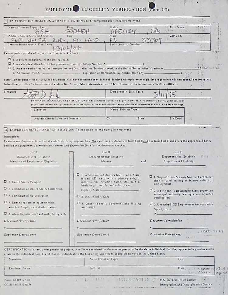 Arbeitsvertrag, ausgefüllt am 11. März 1995 von Stephen Gregory Bier (aka Pogo, Madonna Wayne Gacy)